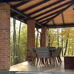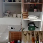 The kitchen amenities at the accommodation feature a refrigerator, an oven, and glassware, provided in an outdoor dining area.